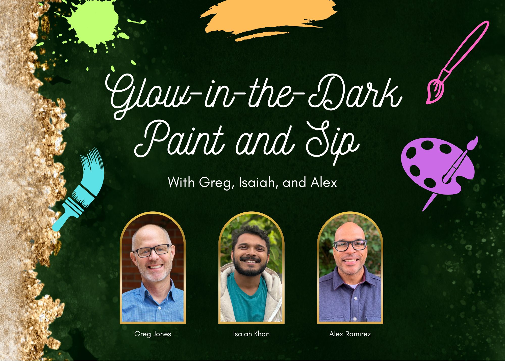 Join Epiphany's own Alex Ramirez (Director of Finance and Operations), Greg Jones (Director of Enrollment Management and Admission), and Isaiah Khan (Events and Community Engagement Manager) for an evening of art and wine. You will have a chance to learn about each of their artistic journeys and view some of their art. After learning a few techniques, you will have a chance to try your hand at some art of your own while Greg and Isaiah provide tips. Accompanying the art will be a selection of wines and hors d'oeuvres carefully curated by Greg and Isaiah themselves. Please join them for a fun evening of art, wine, and conversation.